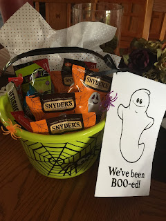 On Thursday night, we had gotten "Booed" by our neighbors. This is one of our favorite traditions this time of year. The door bell rang and when we went to look there was a monster basket filled with cinnamon sugar donuts and apple cider. Such a fun change from candy! So Friday night we were off to "Boo" another neighbor. While the kids love getting "booed", I think they are even more excited to do it to someone else! We loaded up a basket with some glow sticks, snacks and Halloween rings.